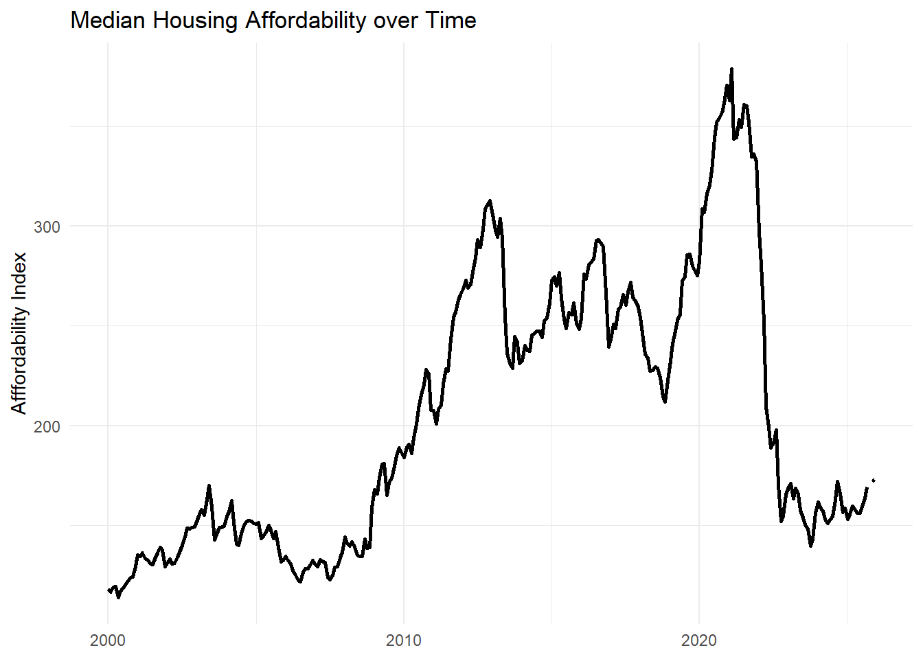 The second peak around 2021 reflects a markedly different dynamic. Unlike the post-2008 period, housing prices were already elevated, but mortgage rates reached historic lows. Low borrowing costs temporarily masked underlying affordability pressures, allowing median affordability to reach its highest observed level despite rising prices. Once interest rates increased rapidly beginning in 2022, affordability declined sharply and immediately.