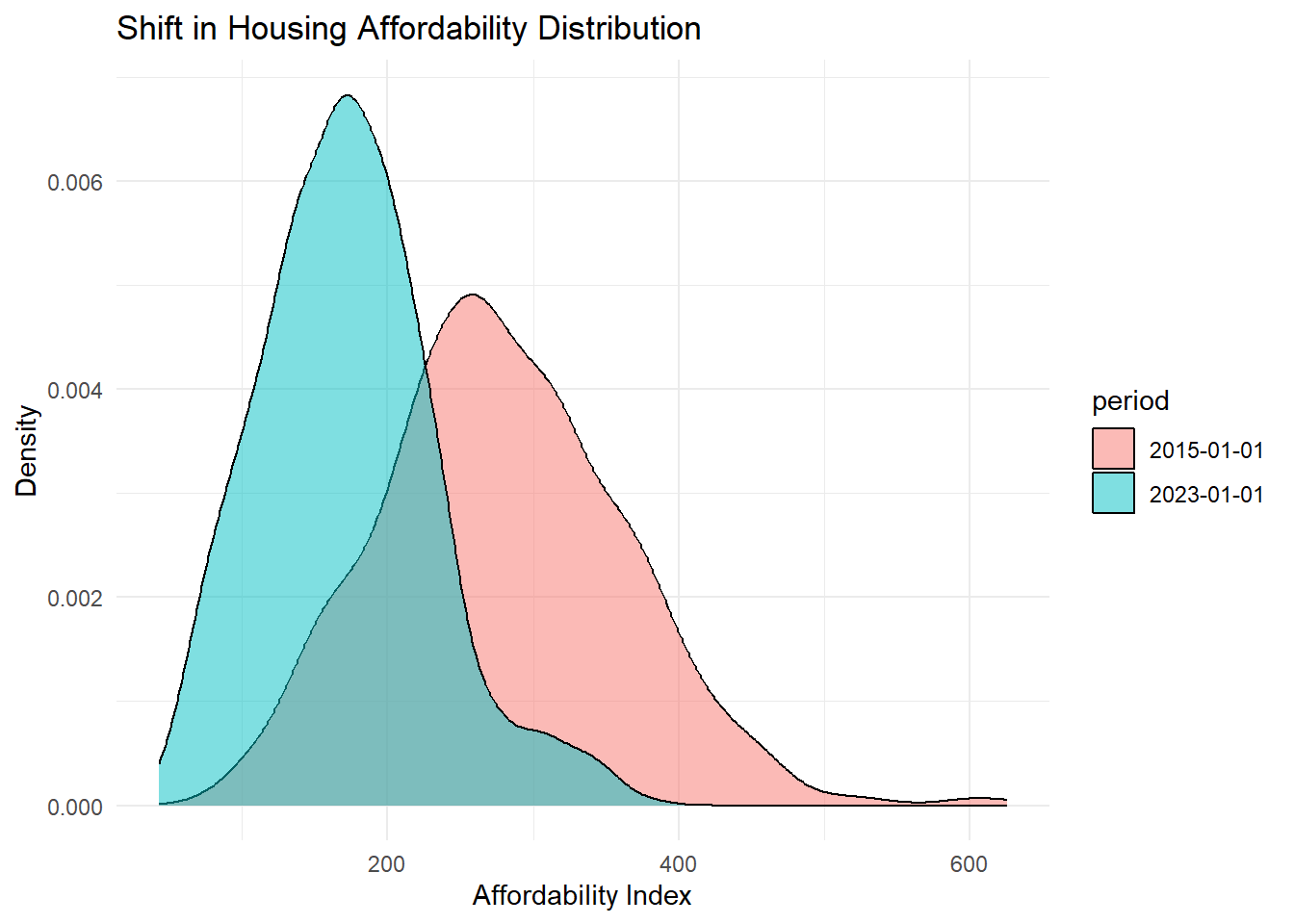 Third, after having examined various top metro localities, we can conclude that predominant affordability features are nationally expressed. This means that affordability is broad-based rather than localized. Distributional analysis over separate time periods also shows a pronounced leftward distribution shift across metros between 2015 and 2023 indicating rising costs affected most housing markets, not only traditionally high-cost regions.