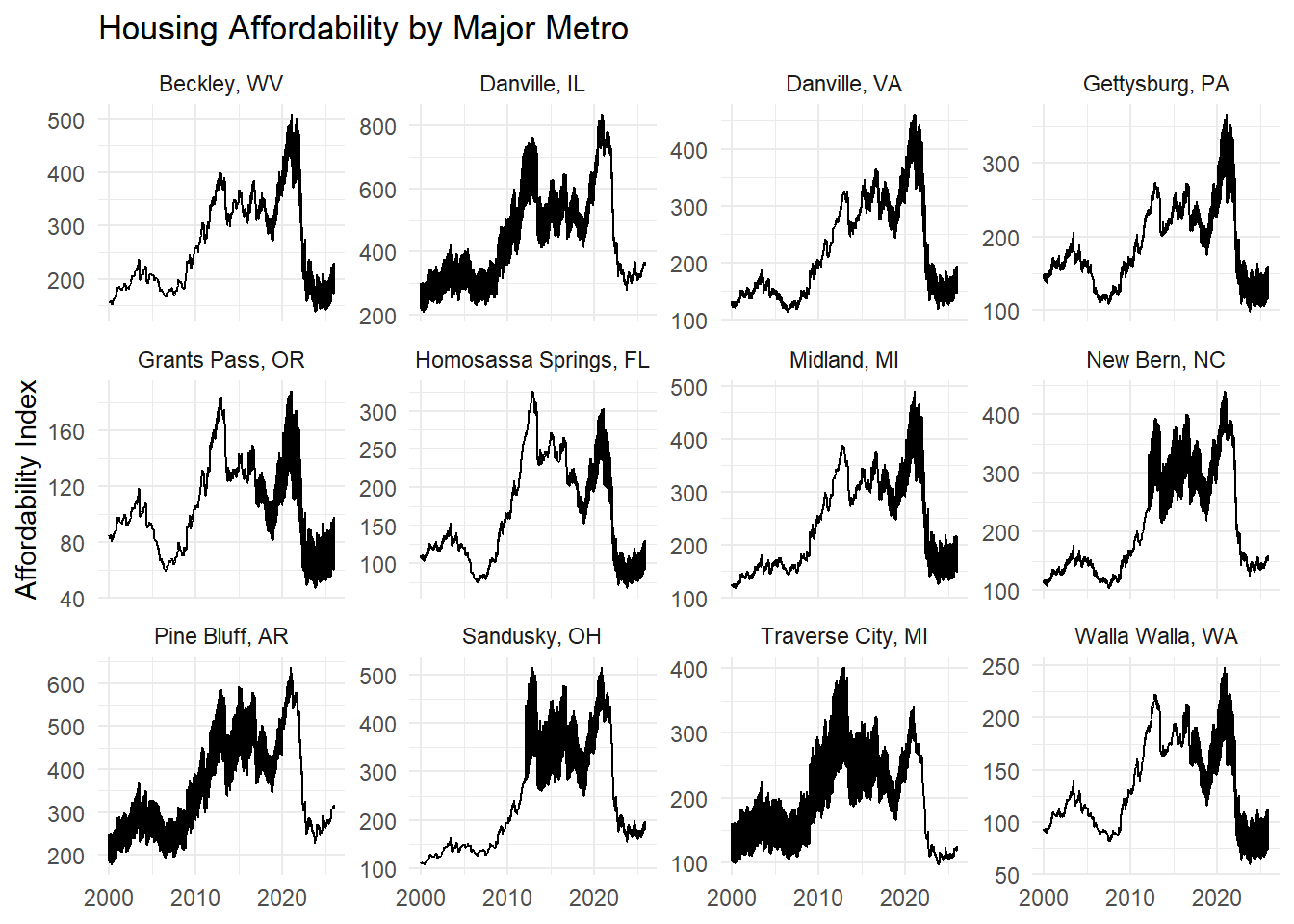 This analysis examined the evolution of housing affordability across U.S. metropolitan areas from 2000 to 2025 by integrating Zillow home value data, FRED mortgage rates and inflation, and Census median household income. By constructing a unified metro_month panel and a transparent affordability index, the analysis distinguishes between short-run affordability shocks and long-run structural pressures.
