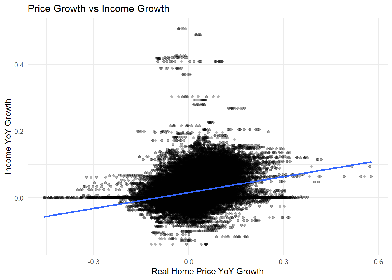 housing_panel %>%filter(!is.na(zhvi_yoy), !is.na(income_yoy)) %>%ggplot(aes(zhvi_yoy, income_yoy)) +geom_point(alpha=.3) +geom_smooth(method="lm", se=FALSE) +labs(title ="Price Growth vs Income Growth",x ="Real Home Price YoY Growth",y ="Income YoY Growth" ) +theme_minimal()