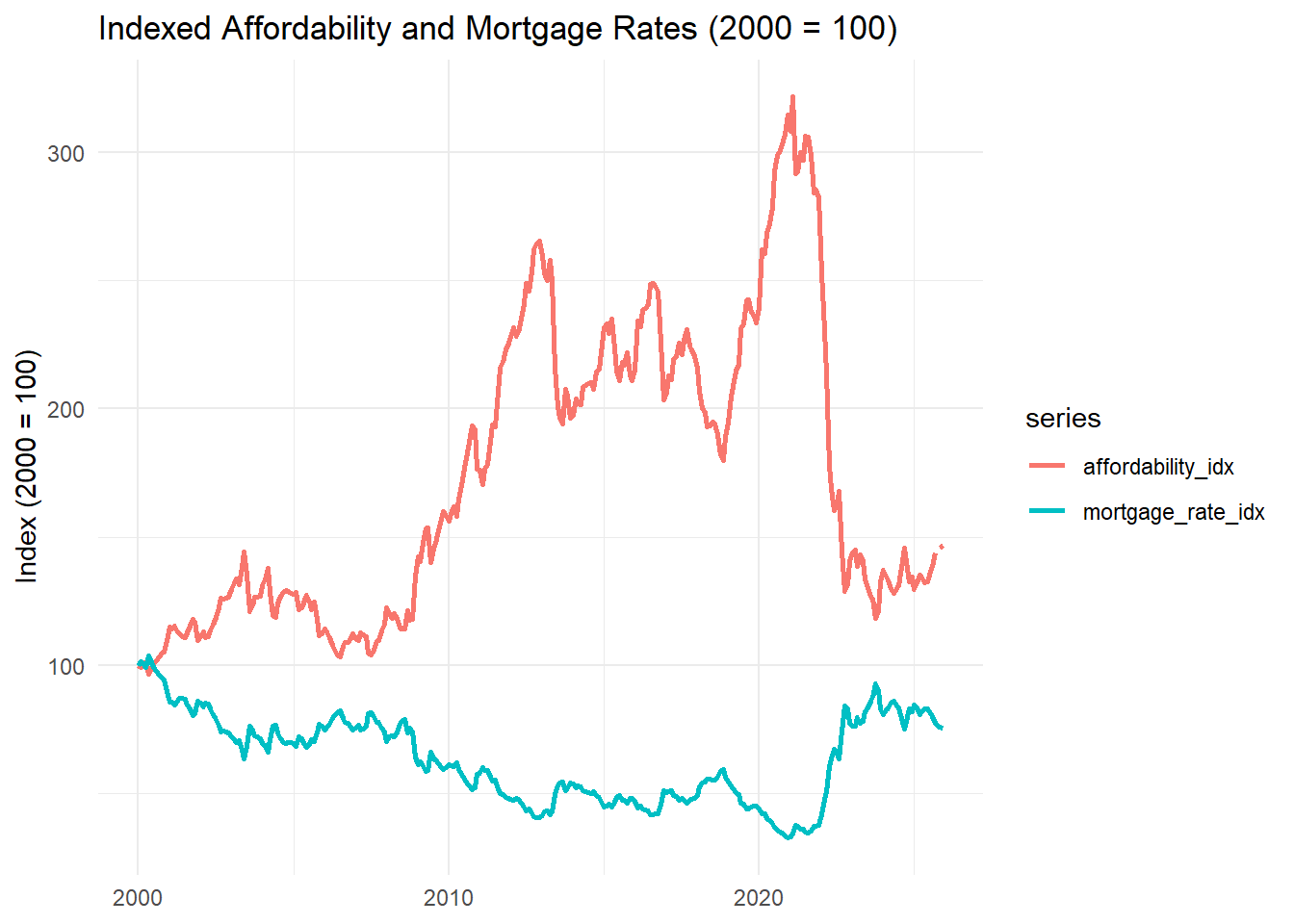 Interpretation: A 1 percentage point increase in the annual mortgage rate is associated with roughly a 20% decline in housing affordability, holding prices and income constant.