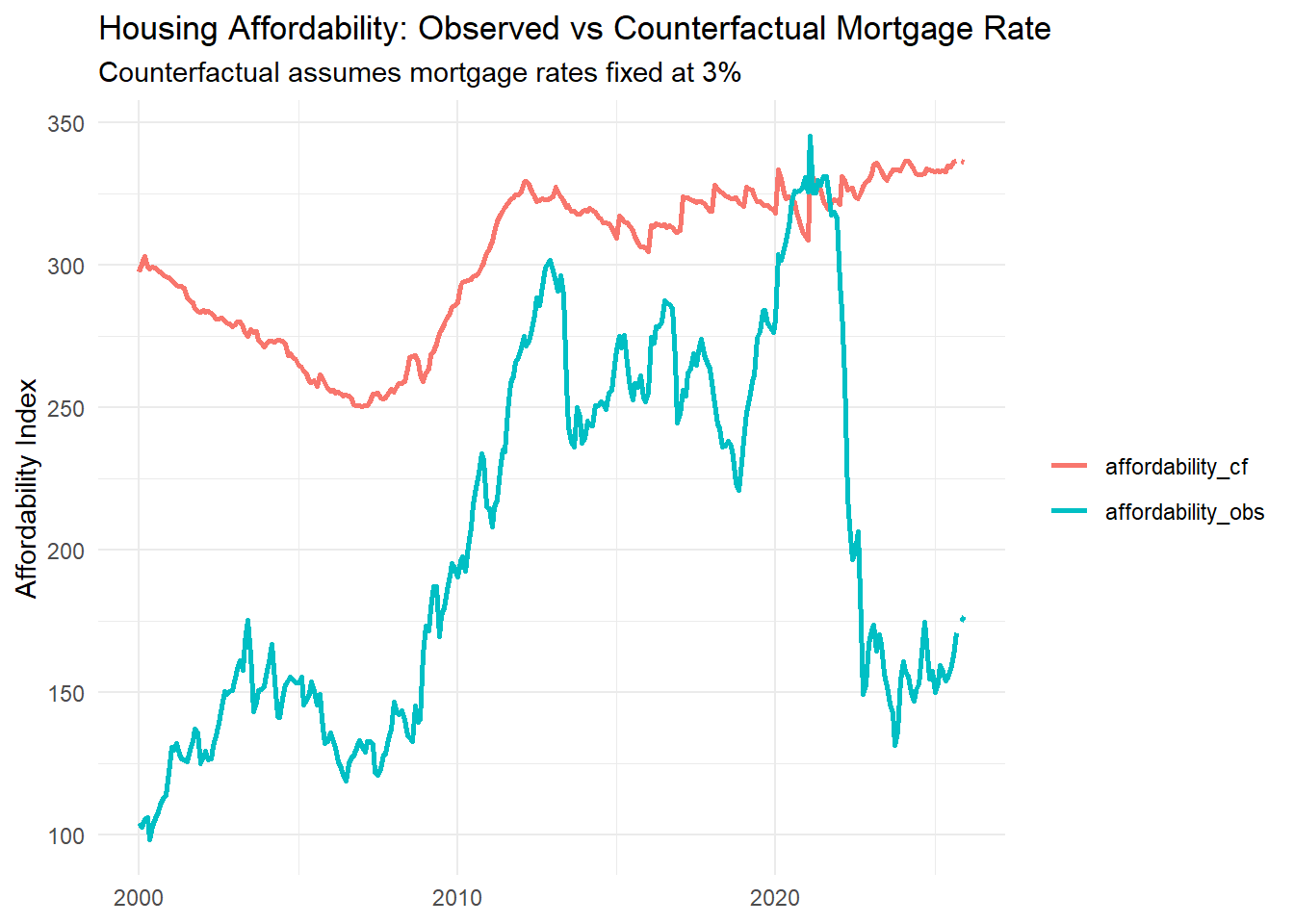 We see that observed affordability collapses after 2021 while the counterfactual line is much higher. The vertical gap is the rate-driven affordability loss.